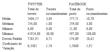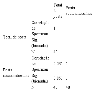 Realizou-se também uma sequência de estatísticas descritivas para análise dos dados. E, por fim, o teste de correlação de Spearman, no intuito de investigar uma possível correlação existente entre o número de postagens totais e o número de postagens de cunho socioambiental. Tanto as estatísticas descritivas quanto o teste de correlação realizaram-se por meio do software SPSS, versão 21.