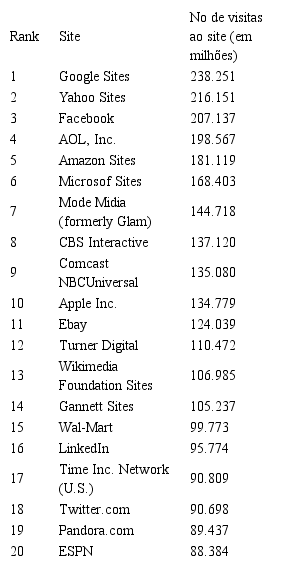 Dados de pesquisa da ComScore (2014), empresa multinacional de pesquisas digitais, revelam os 20 sites mais acessados nos Estados Unidos em dezembro de 2014. A Tabela 1 apresenta os resultados da pesquisa:
