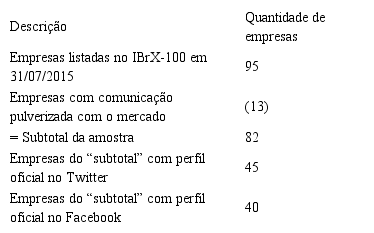 O número de empresas da amostra partiu do total de empresas que possuem ações negociadas no IBrX100 na data de 31 de julho de 2015, totalizando 95 companhias. O IBrX100 é um índice de preços que mede o retorno de uma carteira teórica composta por 100 ações selecionadas entre as mais negociadas da BM&FBovespa, em termos de número de negócios e volume financeiro (BM&FBovespa, 2015). Destas, foram excluídas empresas que possuem comunicação com o mercado de forma pulverizada, não apenas através de um único agente econômico, o que dificultaria de forma considerável detectar quantas redes sociais a empresa possuía, reduzindo a amostra para 82 empresas. Por fim, identificou-se dessas quantas companhias possuíam perfis nas redes sociais Twitter e Facebook, consultando-se a página oficial de cada empresa disponível no sitio eletrônico da BM&FBovespa, resultando em uma amostra final de 45 empresas com perfil no Twitter e 40 companhias no Facebook. Uma visão geral da seleção da amostra pode ser observada conforme Tabela 2.