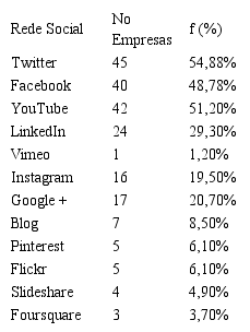 A Tabela 4 apresenta, em atendimento ao primeiro objetivo especifico proposto, as redes sociais utilizadas pelas 82 empresas participantes da subamostra deste estudo, bem como uma frequência correspondente ao número total de empresas dessa subamostra.