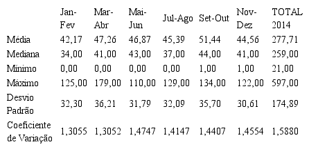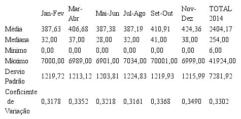 Conforme tabelas 5 e 6, e para atendimento ao segundo objetivo específico proposto, expõem-se estatísticas descritivas, bimestre a bimestre, do número total tweets e posts das empresas ao longo de 2014, respectivamente.