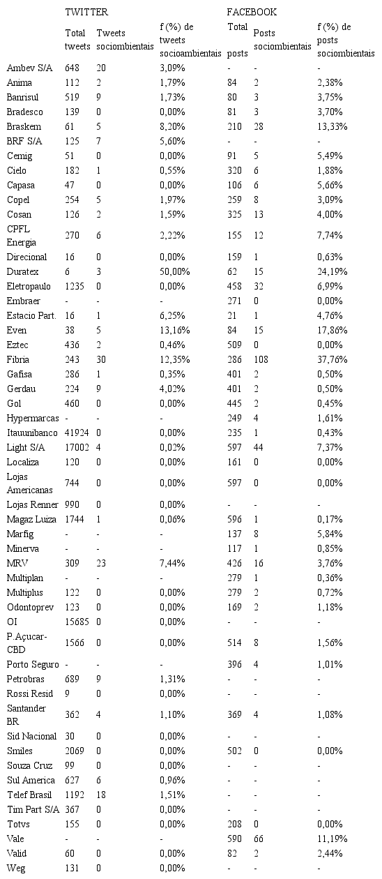 A Tabela 7 evidencia o total de tweets e posts socioambientais de cada empresa participante da amostra, assim como a frequência destes quando em comparação com o tweets e posts totais divulgados pelas firmas.