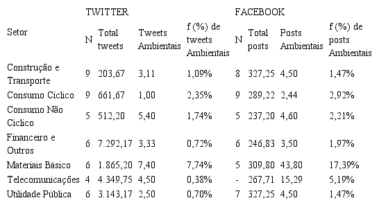 Pela Tabela 9, pode-se observar que a média geral do número de tweets socioambientais (3,84) é consideravelmente baixa quando comparada à média geral do total de tweets divulgados (2.404,17). O mesmo pode ser observado ao comparar a média geral de posts no Facebook de cunho socioambiental (10,70) com a do total de posts (277,71). Dessa forma, em uma análise geral, sugere-se um baixo nível de disclosure socioambiental das empresas analisadas via redes sociais.