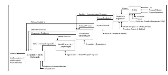 Os fluxos e funções na Logística Reversa compreendem as atividades de coleta, inspeção e separação, armazenamento, processo de desmontagem, densificação para compactação e logística de saída (Bai & Sarkis, 2013). Para os autores, a densificação ou compactação envolve aumentar a densidade dos materiais recicláveis para reduzir os custos de transporte e para facilitar a movimentação.