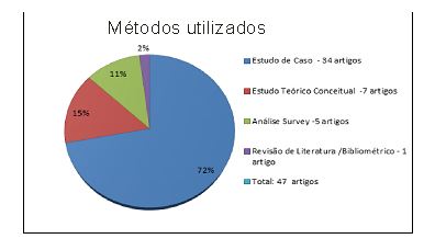 A Figura 6 identifica os Métodos mais utilizadas pelos autores dos artigos estudados, sendo que o destaque esteve para o Estudo de Caso. Denota-se que 5 estudos utilizaram métodos quantitativos com maiores amostragens.