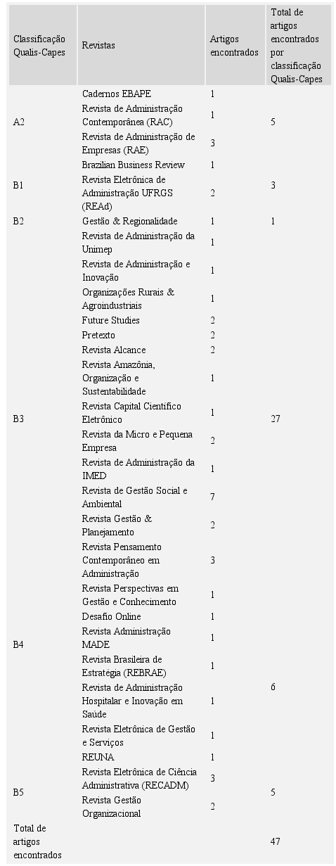 Para encontrar os resultados, foram feitas análises não só em relação aos artigos em si, aos períodos das publicações, mas também em relação à classificação dos periódicos nos quais estão publicados os 47 artigos. Para a classificação, foi utilizada a Qualis-CAPES-2014, classificação da produção intelectual dos veículos dos programas de pós-graduação para a divulgação da sua produção, conforme lista disponibilizada pela CAPES, atualizada no ano de 2014 (Ministério da Educação, 2015).