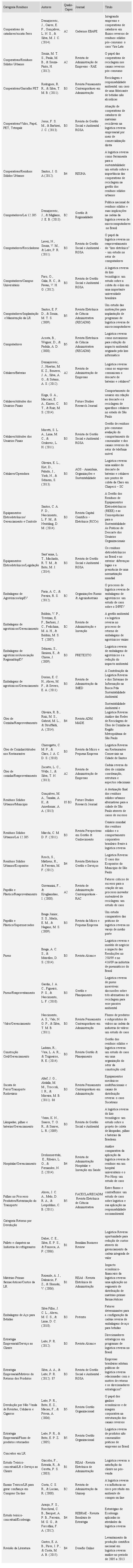 O estudo objetivou analisar artigos de periódicos contidos na base SPELL cobrindo a expressão “Logística Reversa”. A base SPELL é um sistema de indexação, pesquisa e disponibilização gratuita da produção científica (SPELL, 2015). A escolha da base se justifica porque os artigos deveriam estar escritos no idioma português, predominantemente por pesquisadores brasileiros, e outras bases consultadas previamente, a base SciELO, por exemplo, possuíam menos de trinta artigos em português sobre Logística Reversa no período inicial das buscas. A base SPELL pertence à Associação Nacional dos Programas de Pós-Graduação e Pesquisa em Administração (Anpad). Foram encontrados 47 artigos. No espaço para pesquisas, da base de dados SPELL, sem seleção de campo específico, foi digitada a expressão “Logística Reversa”, no mês de maio de 2015.