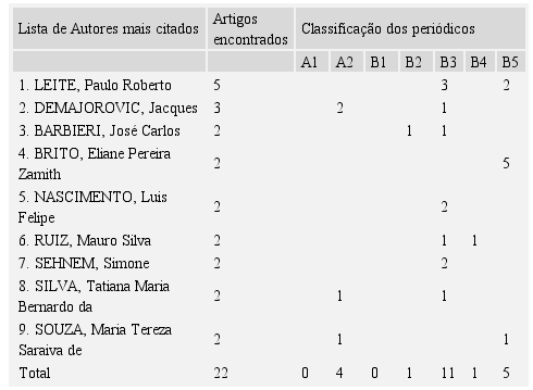 Quanto aos autores, foram encontrados 124 autores nos 47 artigos. Na figura 5 estão os nomes daqueles autores que publicaram mais de um artigo e a classificação dos periódicos nos quais esses autores publicaram.