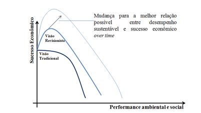 Na Figura 2, dois pontos de vista podem ser generalizados para o caso de desempenho de sustentabilidade. A curva decrescente é usada para representar a visão “tradicionalista” (da relação entre o desempenho de sustentabilidade e desempenho econômico) e a curva em forma de U ao contrário representa o ponto de vista “revisionista”, que é a capacidade de inovar e desenvolver novas tecnologias e abordagens de produção, sendo, portanto, uma maior determinante da competitividade e do sucesso econômico do que os fatores tradicionais de vantagem competitiva (Porter & van der Linde, 1995). A dinâmica de longo prazo é indicada pela linha mais acima, representando o desenvolvimento de fronteira da eficiência ao longo do tempo devido à técnica, regulatória e mudanças do mercado. O ponto ótimo refere-se à situação na qual as empresas otimizam os benefícios para os stakeholders e os lucros para os acionistas (Schaltegger & Wagner, 2006).