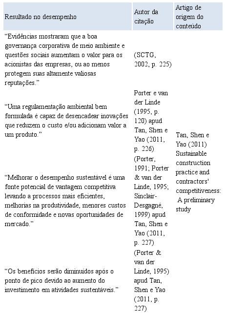 Tan, Shen e Yao (2011) publicaram em seu artigo uma revisão das práticas sustentáveis na indústria da construção e a relação entre o desempenho de sustentabilidade e a competitividade. Uma das principais vantagens citadas pelos autores é que essas ações serão fontes de competitividade no futuro para esses construtores. Na Tabela 6podem-se observar as principais citações utilizadas pelos autores para validar seu argumento inicial, como agregar valor para os acionistas (SCTG, 2002), inovações que surgirão a partir de uma regulamentação ambiental bem formulada, entre outros. Mas um ponto importante a destacar nesse artigo é a citação de Porter e Van der Linde (1995, p. 120), que indica que os benefícios serão reduzidos após o ponto de pico devido ao aumento do investimento em atividades sustentáveis. Esse seria um fator que se pode considerar como desempenho indesejado ocasionado pela adoção de práticas e iniciativas sustentáveis.