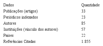 A partir do levantamento bibliométrico na base SSCI-WoSdas publicações indexadas até 2014 – conforme procedimentos metodológicos descritos na seção anterior deste artigo –, foram encontrados 33 artigos que tratam de práticas ou iniciativas sustentáveis e desempenho organizacional. Ao se analisar esses trabalhos, foi possível identificar que eles foram publicados em 23 periódicos indexados à WoS e foram escritos por 85 autores vinculados a 57 instituições localizadas em 22 diferentes países. Identificou-se, também, que esses 33 artigos utilizaram 1.855 referências bibliográficas, uma média de 56 referências por artigo. Na Tabela 1 apresenta-se um panorama dos resultados gerais (dados bibliográficos) obtidos na pesquisa.
