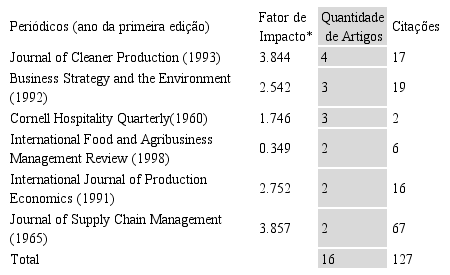 Quando analisados os 23 periódicos nos quais os 33 artigos estão publicados,foram identificadas duas listas: uma lista com os periódicos que se destacam por quantidade de artigos publicados sobre o assunto iniciativas/práticas de sustentabilidade associadas ao desempenho organizacional (Tabela 2, seis periódicos com pelo menos dois artigos sobre o tema); e outra lista com os periódicos que possuem as maiores quantidades de citações decorrentes dos artigos que publicaram sobre o assunto (Tabela 3, periódicos com mais de 10 citações).Ao observar os periódicos da Tabela 2, por exemplo, foi possível perceber que a maior parte dos artigos sobre o assunto (10 dos 16 artigos) foi publicada nos anos 2013 e 2014; e que são poucos os periódicos que têm mantido ao longo dos anos uma frequência constante de publicações sobre o assunto, com exceção do Journal of Cleaner Production (4 artigos) e Business Strategy and the Environment (3 artigos), que têm artigos sobre o assunto sendo publicados de modo recorrente nos últimos quatro anos (2011 a 2014). Enquanto outros periódicos, por exemplo, o Journal of Supply Chain Management publicou os dois artigos identificados (Tabela 2) nos anos 2005 e 2009, não mantendo uma frequência de publicações sobre o assunto nos anos posteriores.Por outro lado, parece haver um recente interesse de alguns periódicos pelo assunto em anos recentes (a partir de 2013), tais como Cornell Hospitality Quarterly– periódico com maior enfoque na área de Turismo com interesse na gestão de empresas e organizações hoteleiras – e oInternational Food and Agribusiness Management Review– periódico interessado em tópicos sobre sistema de alimentos e agronegócios, com sua primeira edição no ano de 1998 (é o mais novo periódico com artigos sobre o tema que está listado na Tabela 2 e possui o menor Fator de Impacto/JCR, que é de 0.349). De modo geral, é possível perceber também que os periódicos listados na Tabela 2 (os quais se destacam por quantidade de artigos sobre a temática) são predominantemente da década de 1990 – com exceção do Cornell Hospitality Quarterly (1960) e Journal of Supply Chain Management (1965) –,possuem Fator de Impacto/JCR entre 0.349 e 3.857 e são responsáveis pela publicação de 48% dos artigos identificados sobre o assunto (16 do total de 33 artigos).