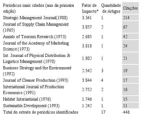 Na Tabela 4 a seguir são listados os dez trabalhos mais citados sobre o tema. O critério de escolhados mais citados deve-se ao fato de esses trabalhos estarem sendo utilizados como base para outras publicações.Ao se analisar as características e a origem desses artigos, foi possível perceber alguns aspectos interessantes: os dois primeiros artigos localizados na base WoS-SSCIsobre o assunto, publicados em 2005, estão entre os mais citados (artigos n.1 e 3 da Tabela 4, com 214 e 42 citações, respectivamente); há somente um artigo publicado nos últimos três anos (2012 a 2014) que está na lista dos mais citados, o trabalho de Golicic e Smith (2013), publicado no Journal of Supply Chain Management (periódico que possui o maior Fator de Impacto/JCR dentre os outros periódicos identificados, JCR=3.857), sugerindo que artigos publicados em periódicos de alto impacto têm maior possibilidade de rapidamente receber citações; todos os artigos mais citados, listados na Tabela 4, estão publicados em periódicos que se destacam em quantidade de citações na temática (identificados anteriormente na Tabela 3); e, dentre os autores dos artigos mais citados, somente Susan L. Golicic (Colorado State University/EUA, que desenvolve pesquisas voltadas para gestão, estratégia e sustentabilidade na cadeia de suprimentos) possui dois artigos sobre o assunto, um publicado em 2009 e outro em 2013 (artigos n.5 e 8 da Tabela 4, com 21 e 15 citações, respectivamente).
