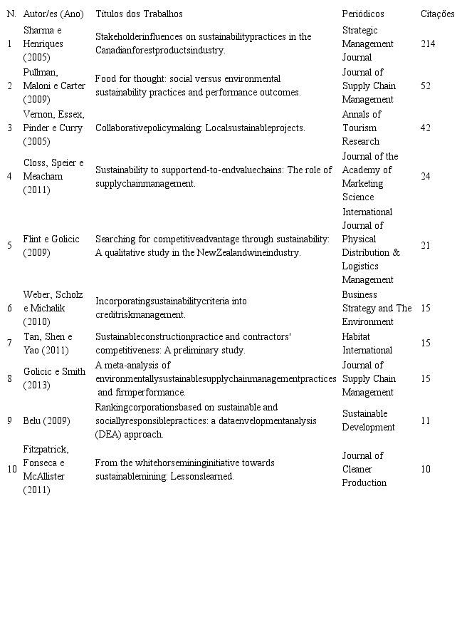 Conforme se observa na Tabela 4, o trabalho de Sharma eHenriques (2005) sobre a influência dos stakeholders nas práticas de sustentabilidade na indústria canadense de produtos florestais apresenta a maior quantidade de citações. Pode-se perceber que o artigo mais citado(214 citações) foi publicado em 2005 e o trabalho mais recentemente publicado, que está na lista dos dez mais citados, foi publicado em 2013: é o artigo de Golicic e Smith (2013), no qual é realizada uma meta-análise que examina mais de 20 anos de pesquisas sobre as práticas de gestão ambiental em cadeias de suprimentos, as quais associam sustentabilidade ambiental com desempenho organizacional. Considerando que tem crescido o interesse das empresas em implementar práticas sustentáveis internamente e em coordenação com outras empresas ao longo de suas cadeias de suprimentos, o trabalho de Golicic e Smith (2013) identificou que há uma relação positiva e significativa entre a realização de práticas de sustentabilidade ambiental na cadeia de suprimentos e o desempenho organizacional (de mercado, operacional e contábil). Além disso, o trabalhocitado aponta que o tipo de indústria, a região das empresas que fizeram parte das amostras das pesquisas analisadas e o tamanho e a idade dessas empresas são fatores que atuam como moderadores da relação positiva entre práticas de sustentabilidade ambiental e desempenho organizacional.