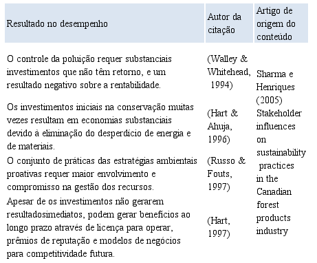 No artigo de Sharma e Henriques (2005) encontra-se uma citação sobre um desempenho indesejado para as organizações ao adotar as práticas sustentáveis no seu negócio: investimentos que não trazem retorno e ocasionam um resultado negativo sobre a rentabilidade (Walley & Whitehead, 1994). Porém no decorrer do trabalho diversos benefícios são citados, sendo os mais importantes a eliminação de desperdícios de energia e materiais (Hart & Ahuja, 1996), gestão de recursos (Russo & Fouts, 1997) e também benefícios a longo prazo, como a obtenção de licença para operar, prêmios de reputação e modelos de negócios para competitividade futura (Hart, 1997).