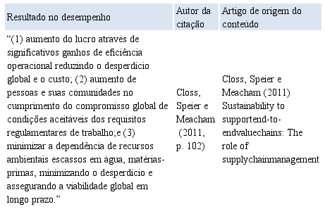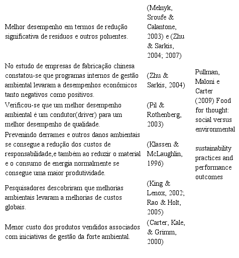 O trabalho de Pullman, Maloni e Carter (2009) apresenta diversos resultados relevantes do desenvolvimento sustentável: menor custo de produto vendido associado às iniciativas de gestão ambiental (Carter, Kale, & Grimm, 2000), melhorias ambientais associadas à melhoria de custos globais (King & Lenox, 2002; Rao & Holt, 2005), a prevenção de derrames e outros danos ambientais que reduz custos de responsabilidade e também a redução de material e consumo de energia normalmente levando a uma maior produtividade (Klassen & McLaughlin, 1996). Pil e Rothenberg (2003) encontraram uma relação positiva entre um melhor desempenho ambiental e um melhor desempenho de qualidade. Zhu e Sarkis (2004) mencionam desempenhos econômicos positivos e negativos, e também se encontra citação de redução significativa de resíduos (Melnyk et al., 2003) ou redução de resíduos e outros poluentes (Zhu & Sarkis, 2004; 2007).