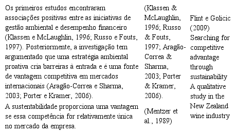 Flint e Golicic (2009) apresentam importantes informações em seus artigos a respeito do desempenho organizacional sendo influenciado pela adoção de práticas sustentáveis, como por exemplo a associação positiva entre as iniciativas de gestão ambiental e o desempenho financeiro (Klassen & McLaughlin, 1996; Russo & Fouts, 1997) e também o fato de que a criação de uma estratégia ambiental cria uma barreira à entrada de novos concorrentes, bem como pode ser fonte de vantagem competitiva (Aragão-Correa & Sharma, 2003; Porter & Kramer, 2006). Mentzer et al. (1989) alegam a vantagem competitiva no caso de a competência ser relativamente única no segmento.