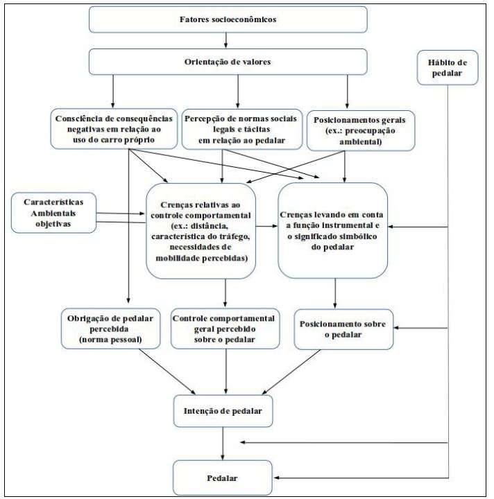 Especificamente sobre a adoção da bicicleta como transporte, Bamberg (2012) adaptou o modelo da Teoria do Comportamento Planejado (TCP), em que, conforme apresentado na Figura 1, se consideram os seguintes aspectos como base informacional para tomada de decisão: conjunto de valores, conhecimento, normas sociais, posicionamentos, experiências passadas e percepções do ambiente físico, além dos fatores socioeconômicos e as características ambientais objetivas.
