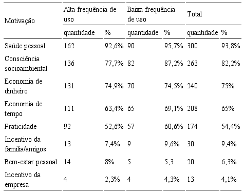 Utilizando o teste qui-quadrado para verificar a associação entre sexo e motivações ou entre sexo e dificuldades, não foram encontradas associações estatisticamente significativas (p0,05). As análises seguintes mostram o valor total e os valores com base em dois grupos: baixa frequência de uso (pontuação 1 e 2 na escala Likert) e alta frequência de uso (pontuação 4 e 5 na escala Likert). As três motivações mais referidas para ir de bicicleta ao trabalho são: saúde pessoal (93,8%), consciência socioambiental (82,2%) e economia de dinheiro (75%). Mas economia de tempo e praticidade também são indicadas pela maioria. Os dados completos podem ser vistos na Tabela 2.