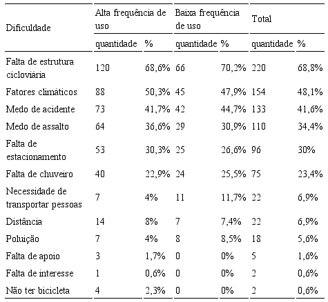 Verifica-se que as barreiras mais mencionadas para utilizar a bicicleta como meio de transporte para o trabalho foram: falta de infraestrutura cicloviária (68,8%), fatores climáticos (48,1%) e medo de acidente (41,6%). Outras barreiras relevantes, com mais de 10% das respostas, são as seguintes: medo de assalto (34,4%), falta de estacionamento adequado (30%) e falta de chuveiro (23,4%). Dentre as barreiras, foi encontrada associação estatisticamente significativa apenas entre frequência e a necessidade de transportar pessoas (Χ2 = 1,699; p = 0,02), indicando que os participantes que possuem a necessidade de transportar pessoas estão mais associados do que o esperado ao grupo que possui uma baixa frequência no uso da bicicleta, assim como participantes que não possuem essa necessidade de transporte estão mais associados ao grupo que possui uma alta frequência do uso da bicicleta (Tabela 3).