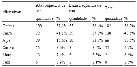 A Tabela 4 mostra que os meios de transporte usados em caso de não se optar pela bicicleta seriam principalmente: ônibus (56,9%) e carro (40,6%). Além disso, foi encontrada associação estatisticamente significativa (Χ2 = 7,427; p = 0,007) entre sexo e a alternativa de uso de carro, o que aponta para um uso do carro maior que o esperado em uma distribuição homogênea em homens e menor do que o esperado em mulheres.