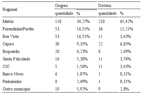 Os pontos de origem e destino foram identificados pelo código postal (CEP) e categorizados dentro das nove regionais da Cidade de Curitiba. A Regional Matriz, localizada na região mais central da cidade, é o destino de 65,42% dos deslocamentos e é origem de 34,27% dos deslocamentos (Tabela 5). Ainda em relação aos destinos, foi identificado que 30% dos locais de trabalho declarados são órgãos públicos. Desse grupo, 11% são órgãos municipais.