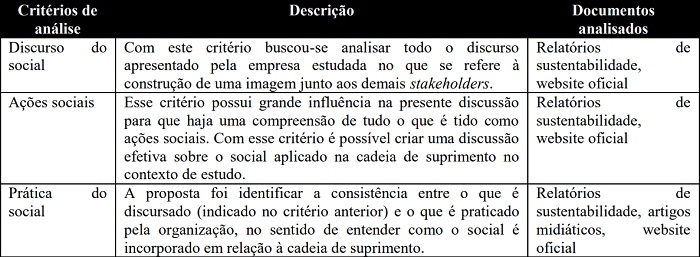 Para a análise dos dados, utilizou-se a análise de conteúdo, definida por Bardin (2009) como o tratamento das informações contidas nas mensagens passadas. A autora indica ser necessário seguir três etapas: (a) pré-análise do material coletado nas entrevistas, bem como dos documentos levantados; (b) análise do material propriamente dito; e (c) tratamento dos resultados. A partir de todos os documentos coletados, foi possível utilizar os critérios de análise e então delinear uma análise dos aspectos sociais desenvolvidos pela empresa selecionada junto a sua cadeia de suprimento. É importante ressaltar que a confiabilidade das informações depende da efetiva divulgação das informações por parte da empresa, todavia, é válida a utilização de todas as informações coletadas, uma vez que estas são consideradas de caráter público.