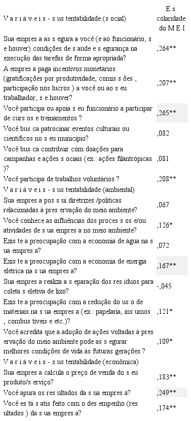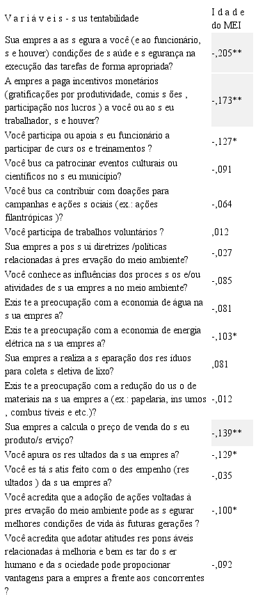 Fonte: Elaborado pelos autores, 2014.* * A correlação é significativa no nível 001 2 extremidadesDentre as variáveis da dimensão ambiental, a preocupação com o consumo e a economia de energia elétrica e a percepção de que a adoção de ações voltadas à preservação do meio ambiente pode assegurar melhores condições de vida às futuras gerações também apresentam correlações negativas com a idade do MEI, de 10,3% e 10% respectivamente, a um nível de 0,05 de significância.