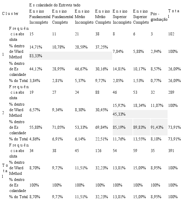Em relação à conjectura de que quanto maior o nível de escolaridade do MEI, mais sensatas e coerentes suas ações e percepções relacionadas ao gerenciamento sustentável dos negócios, nota-se que os dados gerados pelo cruzamento das variáveis clusters versus escolaridade (Tabela 3) apresenta um alto percentual (83,33%) de formação básica para os microempreendedores, pertencentes ao cluster 1, agrupamento de microempreendedores individuais que retratam a ausência de ações e a baixa percepção relacionadas ao bem-estar do ser humano, à preocupação com meio ambiente e aos resultados economicamente sustentáveis do negócio. Por outro lado, os MEIs pertencentes ao cluster 2, agrupamento que apresenta ações assertivas e percepções prudentes referentes à sustentabilidade dos negócios, somam 45,33% com ensino superior incompleto, completo e pós-graduação.