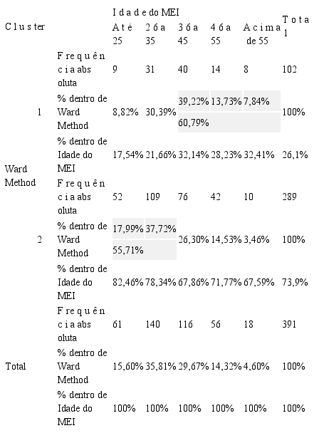 Com relação à idade, percebe-se, de acordo com a Tabela 4, que 55,71% dos MEIs pertencentes ao cluster 2, grupo representante das boas ações e percepções relacionadas à sustentabilidade, estão abaixo da média de idade da amostra, caracterizando- se como um grupo mais jovem. Enquanto que a maior parte dos MEIs pertencentes ao cluster 1 (60,79%) está acima dos 35 anos de idade.