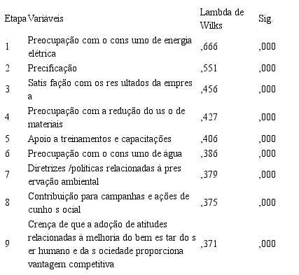 Nesse contexto, nove variáveis foram extraídas na análise e a estatística Lambda de Wilks mostrou-se significativa na discriminação dos dois agrupamentos. A Tabela 5 apresenta, de forma resumida, os resultados da análise discriminante. Os resultados permitem concluir que o padrão de resposta dessas variáveis foi significativamente distinto entre os clusters, sendo, portanto, essas variáveis representativas das ações e das percepções que mais discriminam o grupo de microempreendedores individuais menos responsáveis em suas ações e percepções referentes à sustentabilidade daqueles mais responsáveis frente ao contexto do triple bottom line.
