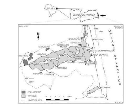 A APA da Barra do Rio Mamanguape está situada no estuário do rio Mamanguape, no estado da Paraíba, e possui praias arenosas com cordões de dunas, arrecifes costeiros, falésias, mata de restinga e de tabuleiro, lagoas e uma área de manguezal com remanescente de Floresta Atlântica, estuários e lagunas (Paludo & Klonowski, 1999), sua localização é apresentada na figura 1.