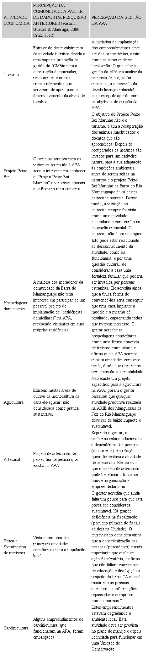 No dia 18 de outubro de 2012, o Sr. Sandro Roberto da Silva Pereira, que, além de chefe atual da APA da Barra do Rio Mamanguape é também Analista Ambiental do ICMBio (Instituto Chico Mendes de Conservação da Biodiversidade), concedeu-nos entrevista para a realização desta análise. No roteiro elaborado para este estudo, pretendeu-se conhecer mais sobre as possíveis alternativas de renda para a comunidade da Barra de Mamanguape, que integra a APA de Mamanguape. Objetivou-se ainda, identificar os principais conflitos existentes entre a gestão da APA e a viabilização destas atividades socioeconômicas. Tentou-se observar também sobre as possíveis áreas de zoneamento que serão definidas no plano de manejo em fase de elaboração e opiniões da gestão da APA em relação aos acessos ao local. Como o Plano de manejo para a APA da Barra do Rio Mamanguape ainda não foi concluído (no momento da pesquisa), o Sr. Sandro não pode informar em que tipos e objetivos específicos de áreas de zoneamento a APA será dividida a partir de sua implementação. No Quadro 01 são descritas as cinco principais atividades econômicas desenvolvidas na APA da Barra do Rio Mamanguape, a partir de dados de pesquisas anteriores (Paulino, Guedes & Madruga, 2009; Cruz, 2012) e entrevista realizada neste estudo com o gestor da APA.