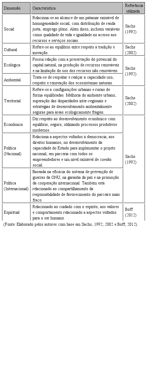 Na visão de Sachs (1992), esse conceito é uma resposta viável e necessária que busca a harmonização de objetivos sociais, ambientais e econômicos da sociedade e é constituído por seis dimensões (social, ecológica, ambiental, econômica, política nacional e política internacional). Já em seu estudo publicado em 2002, Sachs acrescenta mais duas dimensões ao DS (dimensões cultural e territorial). Atualmente há mais uma dimensão que está sendo incluída quando se trabalha com concepções de desenvolvimento sustentável, é a dimensão espiritual (Boff, 2012). A Tabela 1 apresenta uma síntese das dimensões do DS.