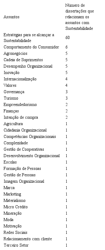 Como próxima análise, optou-se por identificar quais os assuntos relacionados com a Sustentabilidade foram abordados em cada dissertação pesquisada, surgindo assim a Tabela 4.