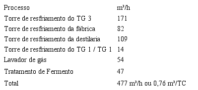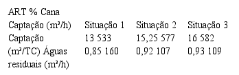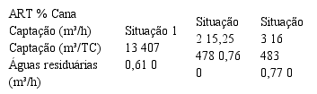 Pode-se observar com a implantação do programa de águas residuais zero, que teve reaproveitamento das águas do processo, com redução de até 150 m³/h ou 28% na captação, que fica com 379 m³/h (0,61 m³ TC) referente ao ART 13% cana, que foi o cenário proposto com maior produção de açúcar. É importante lembrar que, quanto mais açucareiro estiver o processo, menor será a captação.