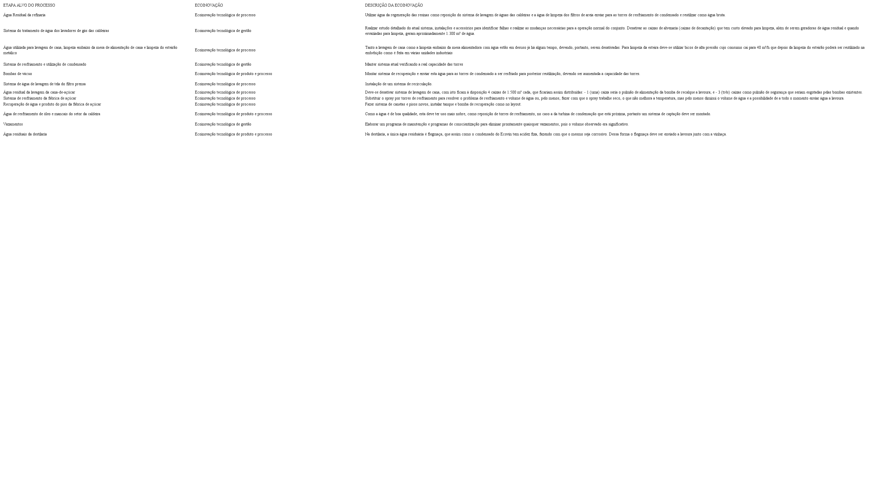 Com o avanço tecnológico e gestão ambiental adequada, os impactos ambientais podem ser totalmente minimizados. Os resíduos gerados do processamento de cana-de-açúcar geralmente são materiais orgânicos que tem grande potencial para reutilização. Com isso, o volume de água doce requerida por esta indústria pode ser significativamente reduzido por meio da recuperação das águas residuais presentes no processo produtivo cana-de-açúcar. Diante do exposto, a questão que motivou este relato foi: quais inovações ambientais (tecnológicas e gerenciais) podem ser utilizadas em uma usina sucroenergética para reduzir ao nível zero a quantidade de águas residuais?