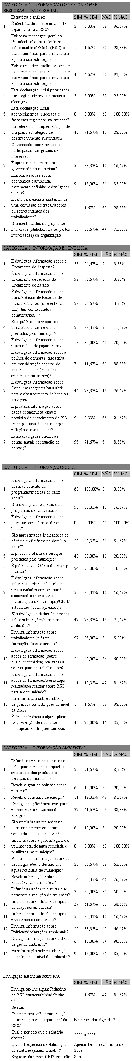 O Apêndice 1 apresenta os itens de informação contemplada em cada categoria, que teve por base a listagem utilizada por Navarro et al. (2010 a- b) e Navarro et al. (2011a-b) bem como as orientações das Diretrizes GRI (2006), ajustadas às especificidades do sector público.