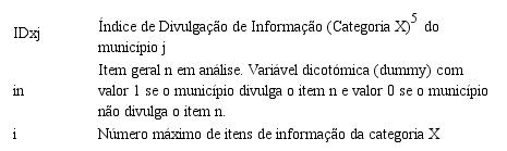 Assim, procedemos ao cálculo dos valores dos índices de divulgação por cada categoria de informação (ou subíndices), de forma a medir o grau de divulgação, sendo o mesmo calculado pelo quociente entre a pontuação total obtida por cada categoria e o número máximo de itens que a constituem, conforme se descreve abaixo, sendo que o valor de cada índice varia entre um mínimo de 0 e o máximo de 1.