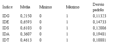 Depois de analisado o número de municípios que divulga sobre os itens de informação previstos em cada uma das categorias, importa agora proceder à análise dos valores obtidos para os índices de divulgação que foram construídos, e que nos permitem medir o nível de divulgação sobre responsabilidade social. Considerando a totalidade dos municípios da amostra, a Tabela 2 resume as medidas estatísticas obtidas para cada um dos subíndices individualmente (IDG, IDE, IDS, IDA) e para o IDT e, dando assim indicação sobre a tendência central dos dados e a localização extrema da amostra em termos de divulgação de informação.
