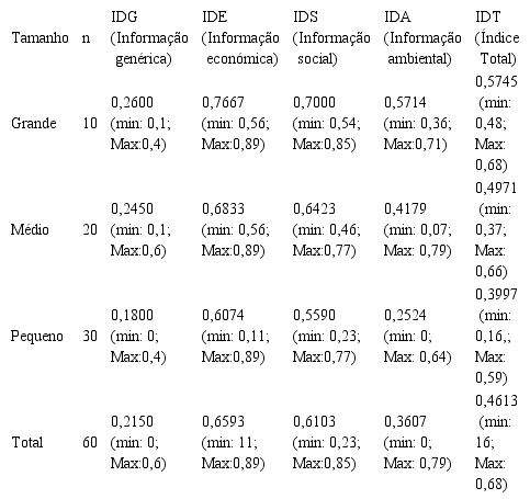 Ao observarmos a tabela 3 podemos concluir que os municípios de grande dimensão são os que apresentam índices de divulgação mais elevados para qualquer tipo de informação, tal como tem vindo a ser afirmado por inúmeros estudos que consideram que o tamanho de um município tem influência no grau de divulgação de informação (por exemplo: Cárcaba García e García-García, 2010; Joseph, 2010; Joseph e Taplin, 2011; Marcuccio e Steccolini, 2009; Mucciaroni, 2012; Ribeiro e Guzmán, 2011e Serrano-Cinca et al., 2009).