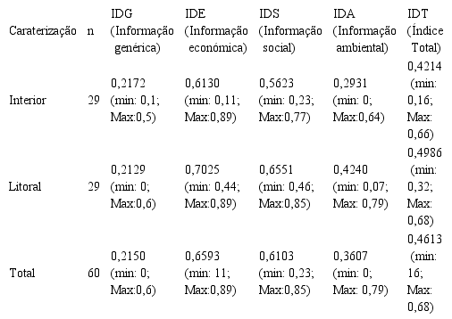 No que respeita aos subíndices, o índice relativo à divulgação de informação económica,é o que apresenta maior valor (IDE=0,6593), seguindo-se a categoria de informação social (IDS=0,6103). O índice respeitante à divulgação de informação ambiental (IDA) apresenta um valor de 0,3607, mostrando que os municípios que constituem a amostra apenas relatam pouco mais de 1/3 dos itens incluídos nesta categoria. Não obstante, o IDA é o que apresenta maior desvio padrão, pelo que, possivelmente, é neste índice onde existem as melhores possibilidades de melhoria a curto prazo. Por último, o índice relativo à informação genérica é aquele que apresenta um menor valor (IDG=0,2150). Também no estudo de Navarro et al. (2011a) baseado nos Governos Regionais espanhóis, o índice de divulgação genérica é o que apresenta o valor mais baixo (0,53) e o IDS e o IDE, os mais altos com 0,66 e 0,61, respetivamente. Navarro et al., (2010a) e 2011b), obtiveram resultados diferentes, sendo a informação de carácter social a que apresentou um maior grau de divulgação (0,52 e 0,7, respetivamente) e a ambiental a de menor divulgação (0,24 e 0,5, respetivamente).