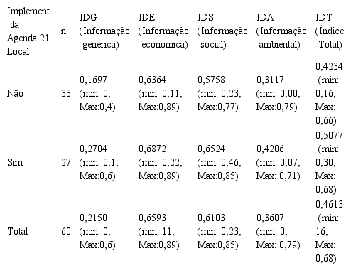Pela simples análise tabela 6, verificamos que os municípios que implementaram a Agenda 21 Local, possuem Índices de divulgação mais elevados em todas as categorias de informação. Esta maior tendência de divulgação de informação pelos municípios que implementam a Agenda 21 Local foi também encontrada nos estudos de Joseph (2010), Joseph e Taplin (2011) e Pilcher et al. (2008).