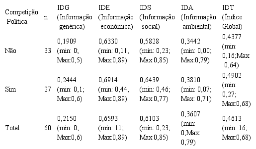 No que diz respeito à competição política, também é naqueles municípios em que existe competição política (ou seja, em que o partido que está no poder tem um menor número de vereadores) que os índices de divulgação são mais altos, tal como ocorreu em estudos elaborados sobre divulgação de informação financeira nos websites de municípios (Cárcaba García e García-García, 2010 e Serrano-Cinca, 2009).