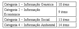 Como referem Ribeiro e Guzmán (2011), esta técnica consiste na codificação das informações qualitativas em categorias pré definidas, sendo utilizada para verificar as práticas de divulgação. Concretamente, no nosso estudo, para aferirmos acerca da divulgação de informação sobre responsabilidade social, utilizou-se uma listagem constituída por 46 itens, divididos em 4 categorias ou blocos de informação4: