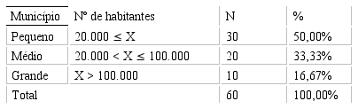 Assim, a Tabela 1 apresenta a distribuição dos municípios da amostra em função do seu tamanho para o ano de 2010, sendo que exatamente metade dos municípios é de pequena dimensão, ou seja, o seu número de habitantes é igual ou inferior a 20.000. Seguidamente, 33,33% dos municípios é de média dimensão e apenas 16,67% é de grande dimensão (mais de 100.000 habitantes).