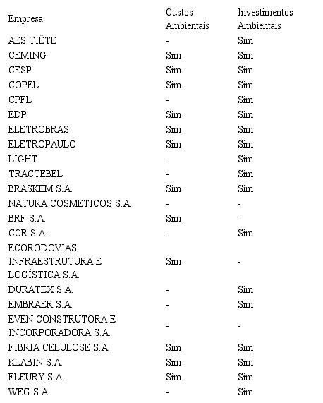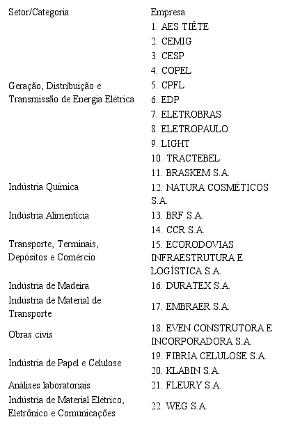 Desse modo, buscou-se analisar se tais empresas, classificadas como potencialmente poluidoras pelo Ibama, realmente divulgam informações contábeis a respeito dos custos e investimentos ambientais uma vez que se espera que o façam na medida em que compõem o ISE, índice que mede o retorno das ações das empresas comprometidas com a sustentabilidade (Rocha et al., 2011). Assim, foram excluídas da amostra 13 empresas, quais sejam: as de telecomunicação; de serviços bancários e financeiros; de seguros e previdência; e as de comércio varejista e atacadista, de modo que, levou-se a cabo a análise das DFP’s das seguintes empresas: