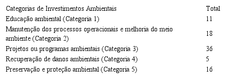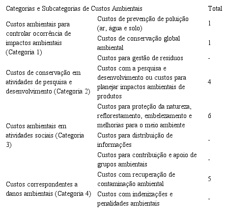 Além disso, adotou-se, para o tratamento dos dados, as categorias e subcategorias de custos e investimentos ambientais utilizadas por tais autores, os quais, por sua vez, basearam-se no modelo de categorização de custos ambientais proposto pela JAPAN Environment Agency (2000) e no modelo de categorização de investimentos ambientais proposto pelo CFC (2004).