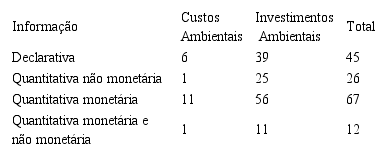 As informações sobre custos e investimentos ambientais também foram analisadas quanto a natureza da informação divulgada, de acordo com o método adotado por Rover, Borba e Borget (2008), que se utilizaram de quatro tipos de evidenciação: Declarativa (evidencia informações de natureza qualitativa e unicamente descritiva); Quantitativa não-monetária (evidencia informações quantitativas por meio de números não monetários); Quantitativa monetária (evidencia informações quantitativas por meio de números monetários); Quantitativa monetária e não monetária (evidencia informações quantitativas monetárias e não monetárias). Todos esses aspectos serão vistos no tópico seguinte, evidenciando-os de forma gráfica e descritiva.