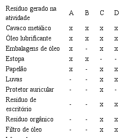 Evidenciou-se que as empresas A e B não quantificam os resíduos advindos das atividades que não fazem parte do processo fabril, tais como lâmpadas, resíduos de escritório e orgânicos. Além disto, constatou-se que nenhuma das empresas pesquisada realiza coleta seletiva dos resíduos supramencionados, sendo estes alocados em uma mesma sacola plástica para recolhimento pelo serviço de coleta municipal. Resíduos de sucata de ferro, ficam alocados em contêineres, expostas às intempéries. Estes contêineres são de uma empresa de sucatas da cidade, a qual compra a sucata de ferro das metalúrgicas. Com relação ao volume de resíduo gerado, as referidas organizações apenas estimam os valores, ou seja, apenas atribuem quantidades aproximadas, não possuindo uma forma efetiva de controle destes materiais.